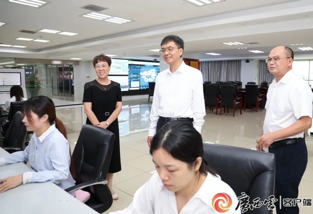 陈刚来到自治区气象局,听取相关工作情况介绍,详细了解预报预测、信息发布、气象服务等情况。广西云-广西日报记者 何学俏 摄