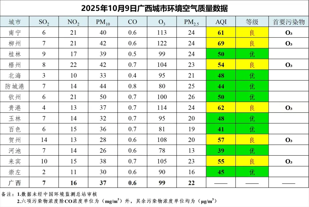 10月9日广西城市环境空气质量数据