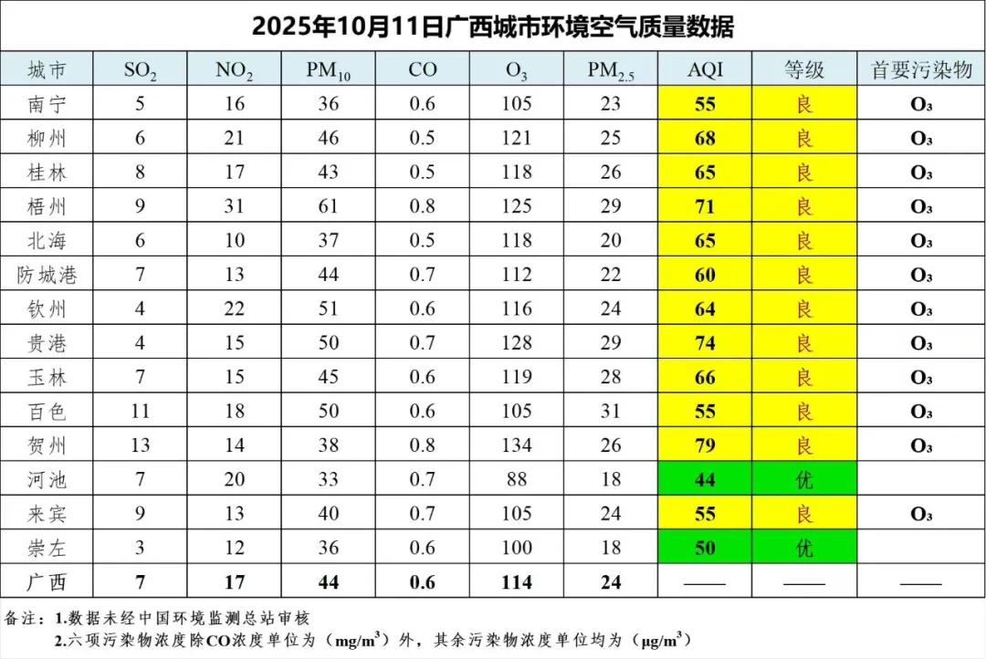 10月11日广西城市环境空气质量数据
