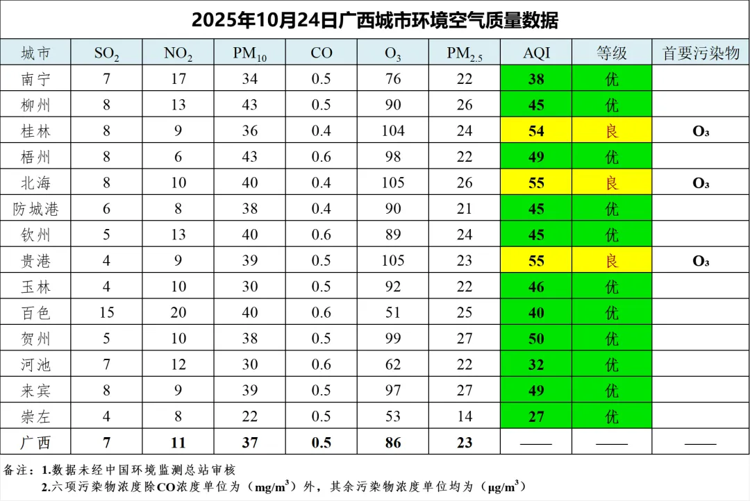 10月24日广西城市环境空气质量数据