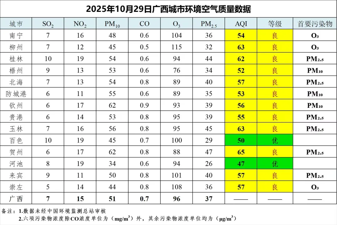10月29日广西城市环境空气质量数据