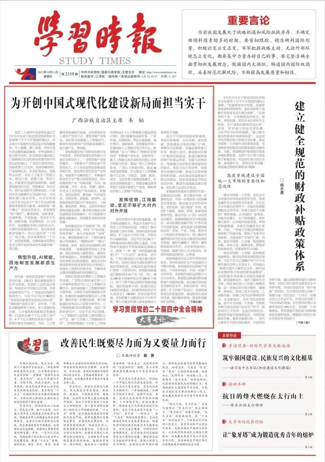 10月31日,《学习时报》头版刊发广西壮族自治区主席韦韬的署名文章《为开创中国式现代化建设新局面担当实干》,全文如下——