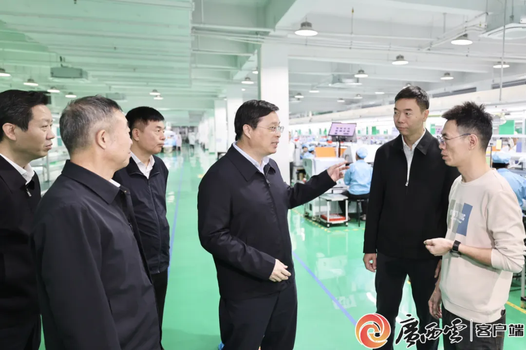 在宾阳县宾州电子信息产业园广西猎声电子科技有限公司生产车间,韦韬了解宾阳电子信息产业发展以及企业生产运营情况。广西云-广西日报记者 邓华 摄