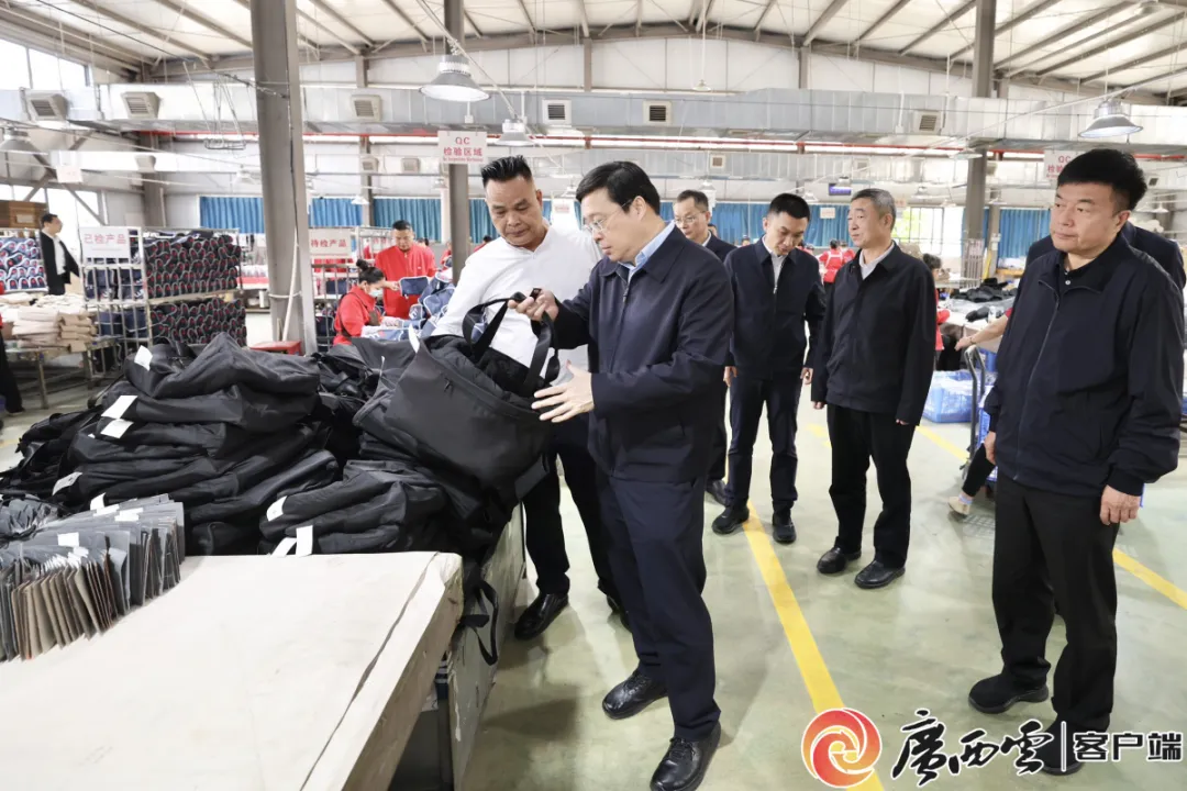 韦韬走进上林县明亮镇易地搬迁安置点南宁市中禾箱包有限公司帮扶车间,了解搬迁群众工作收入等情况。广西云-广西日报记者 邓华 摄