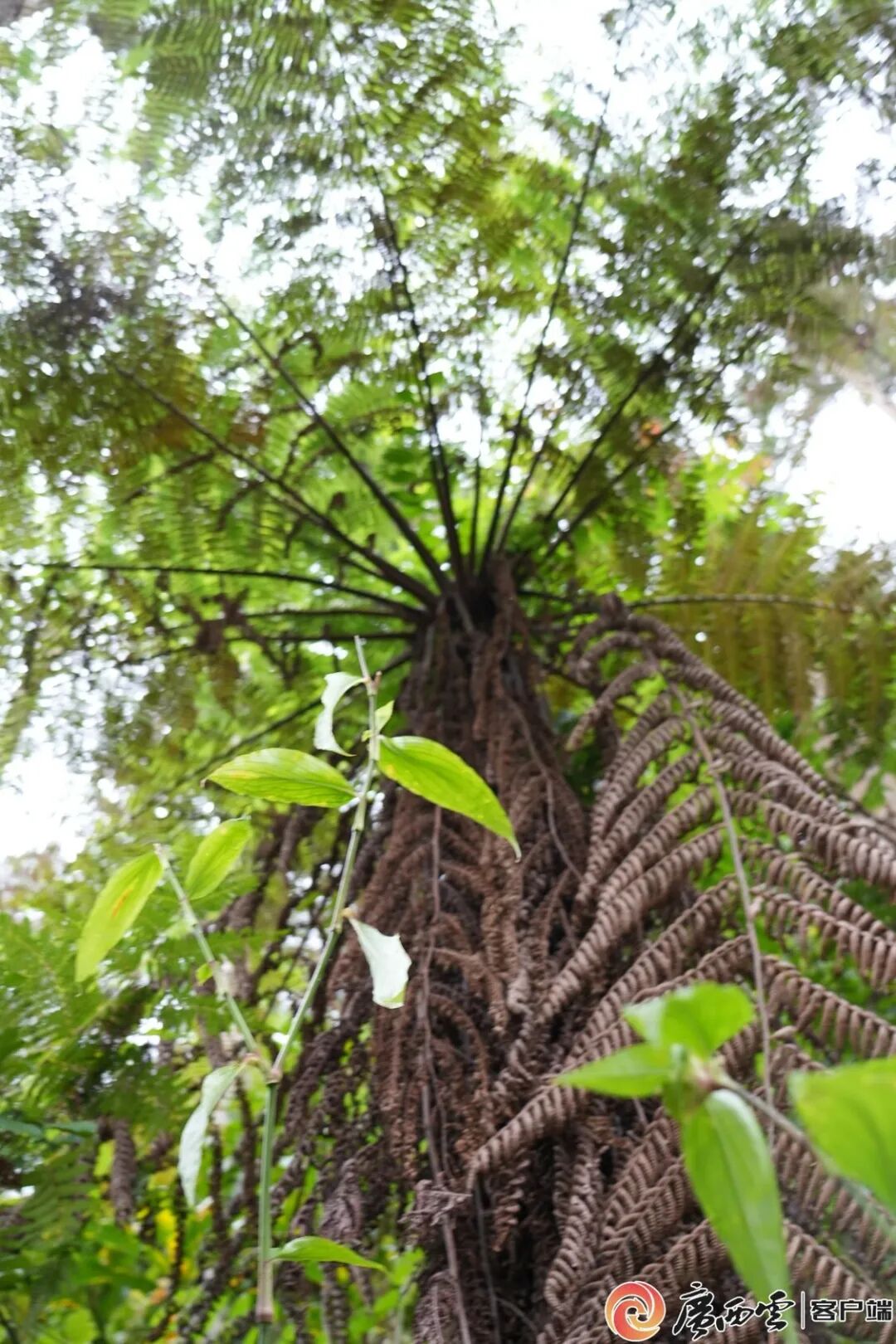 记者随禤琼飞沿212国道旁林间小径拾级而上,眼前景象令人震撼:成片高大蕨类密集生长,茎干最高5.7米,羽状叶片层层叠叠如巨伞。1243株桫椤错落分布在412.2亩山谷间,让人瞬间仿若穿越回亿万年前的侏罗纪时代。