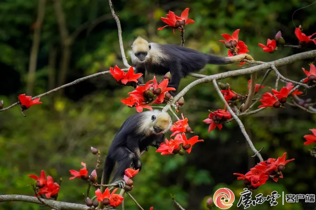 在白头叶猴保护区,两只白头叶猴跳上木棉树摘花品尝。朱小明 摄(资料图)