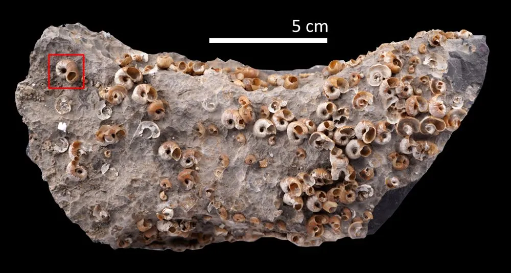有中华江旋螺固着的石头,红框为选模标本。张乐嘉 摄 图源:新华社(资料图)
