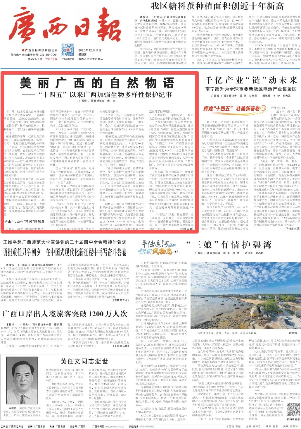 相关部门统计数据显示,伴随着广西实施生物多样性保护战略与行动计划和一系列生物多样性保护重大工程,目前全区已建立223处自然保护地,有陆生野生脊椎动物1151种、野生高等植物物种数10466种,生物多样性丰富度居全国第3。截至今年11月底,在自然保护地及周边范围,东黑冠长臂猿(中国境内)种群数量从发现之初的3群19只增长到5群40多只,瑶山鳄蜥野外种群数量达500多只。