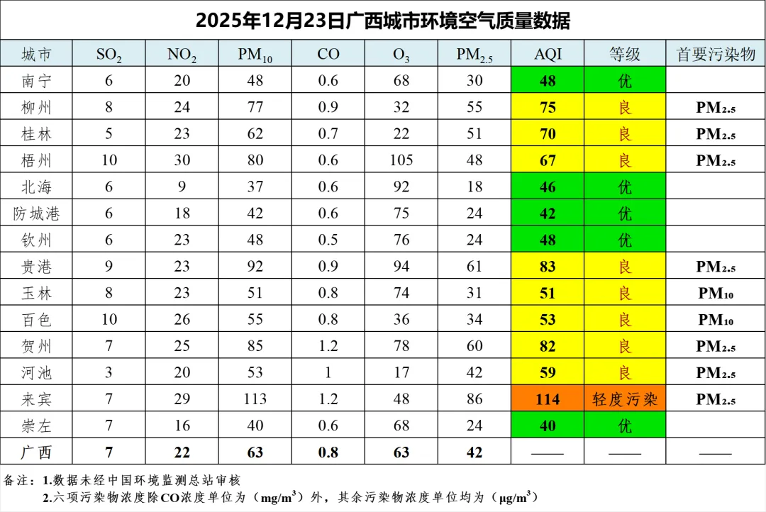 12月23日广西城市环境空气质量数据