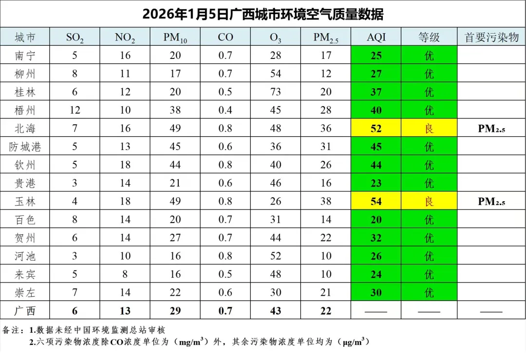 1月5日广西城市环境空气质量数据