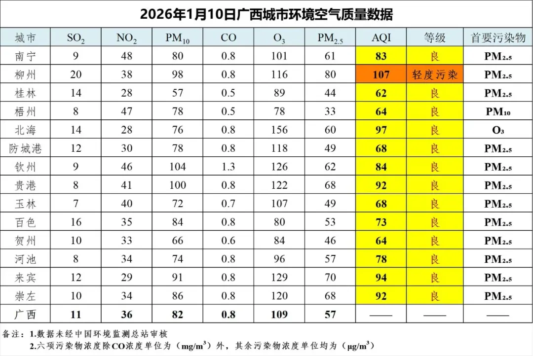 1月10日广西城市环境空气质量数据