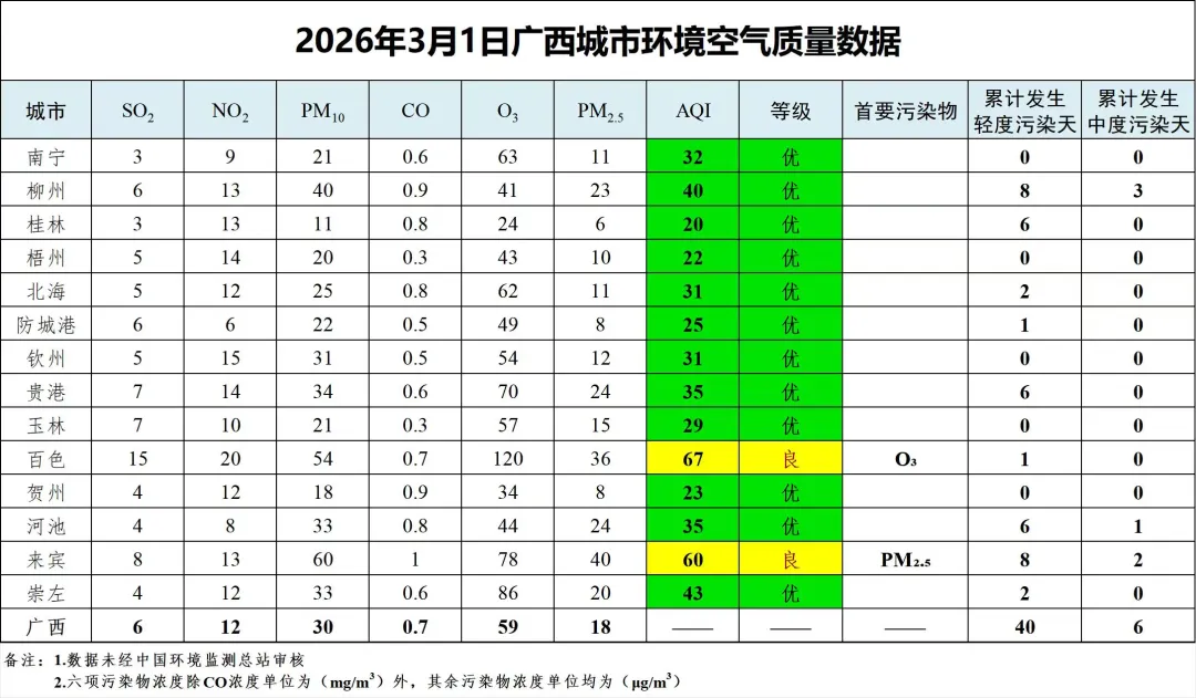 3月1日广西城市环境空气质量数据