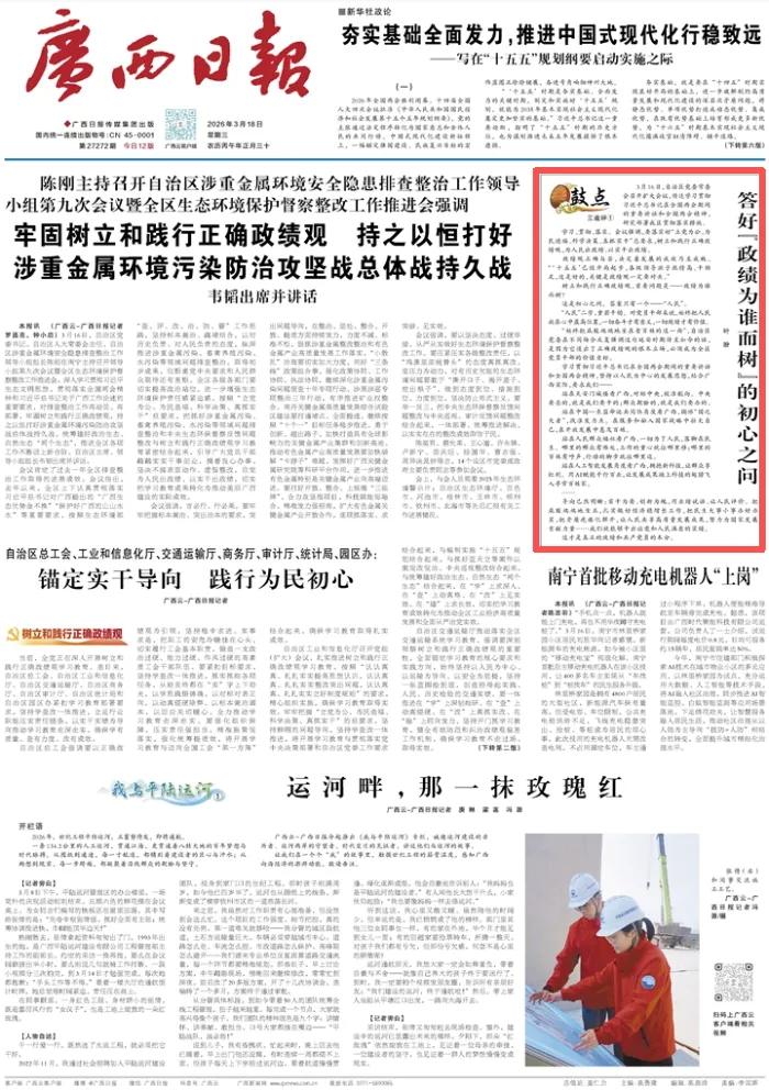 今日(3月18日),广西日报头版刊发“鼓点”评论文章《鼓点三连评①:答好“政绩为谁而树”的初心之问》。全文如下——