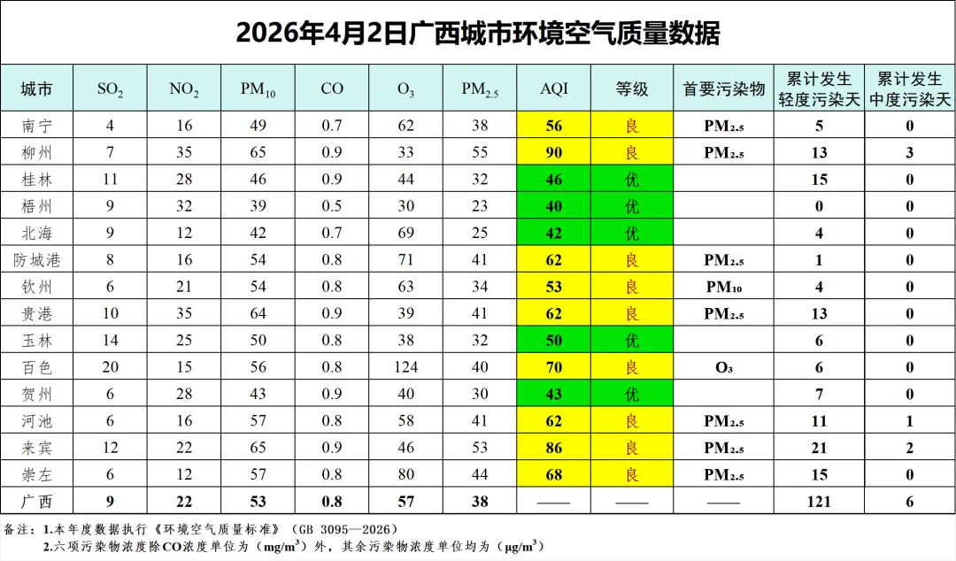 4月2日广西城市环境空气质量数据