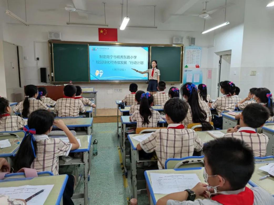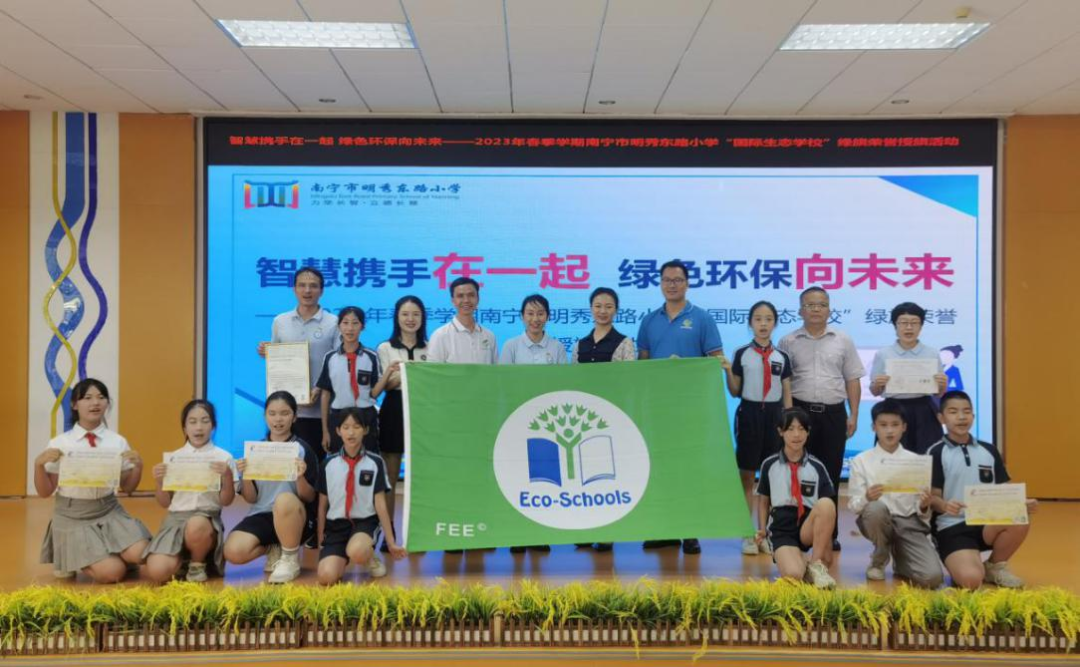 2023年上半年,生态环境部宣传教育中心公布2022年(第十一批)国际生态学校项目绿旗认证结果,南宁市明秀东路小学通过认证,荣获“国际生态学校”绿旗荣誉称号。