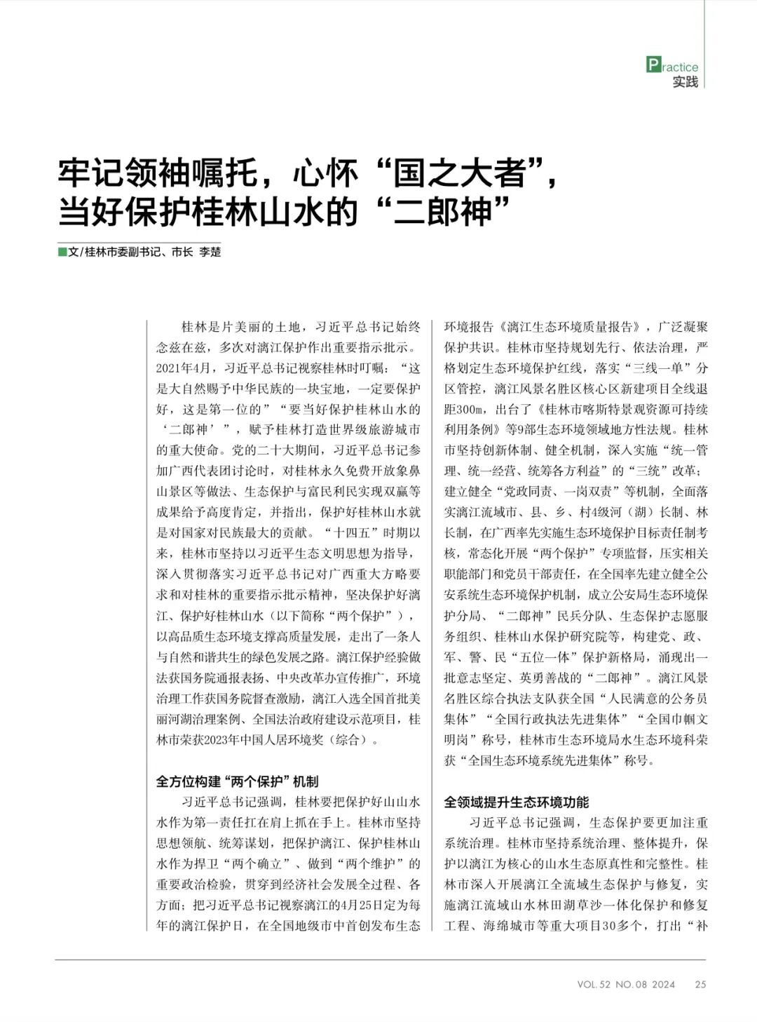 习近平总书记强调,桂林要把保护好山山水水作为第一责任扛在肩上抓在手上。桂林市坚持思想领航、统筹谋划,把保护漓江、保护桂林山水作为捍卫“两个确立”、做到“两个维护”的重要政治检验,贯穿到经济社会发展全过程、各方面;把习近平总书记视察漓江的4月25日定为每年的漓江保护日,在全国地级市中首创发布生态环境报告《漓江生态环境质量报告》,广泛凝聚保护共识。桂林市坚持规划先行、依法治理,严格划定生态环境保护红线,落实“三线一单”分区管控,漓江风景名胜区核心区新建项目全线退距300m,出台了《桂林市喀斯特景观资源可持续利用条例》等9部生态环境领域地方性法规。桂林市坚持创新体制、健全机制,深入实施“统一管理、统一经营、统筹各方利益”的“三统”改革;建立健全“党政同责、一岗双责”等机制,全面落实漓江流域市、县、乡、村4级河(湖)长制、林长制,在广西率先实施生态环境保护目标责任制考核,常态化开展“两个保护”专项监督,压实相关职能部门和党员干部责任,在全国率先建立健全公安系统生态环境保护机制,成立公安局生态环境保护分局、“二郎神”民兵分队、生态保护志愿服务组织、桂林山水保护研究院等,构建党、政、军、警、民“五位一体”保护新格局,涌现出一批意志坚定、英勇善战的“二郎神”。漓江风景名胜区综合执法支队获全国“人民满意的公务员集体”“全国行政执法先进集体”“全国巾帼文明岗”称号,桂林市生态环境局水生态环境科荣获“全国生态环境系统先进集体”称号。