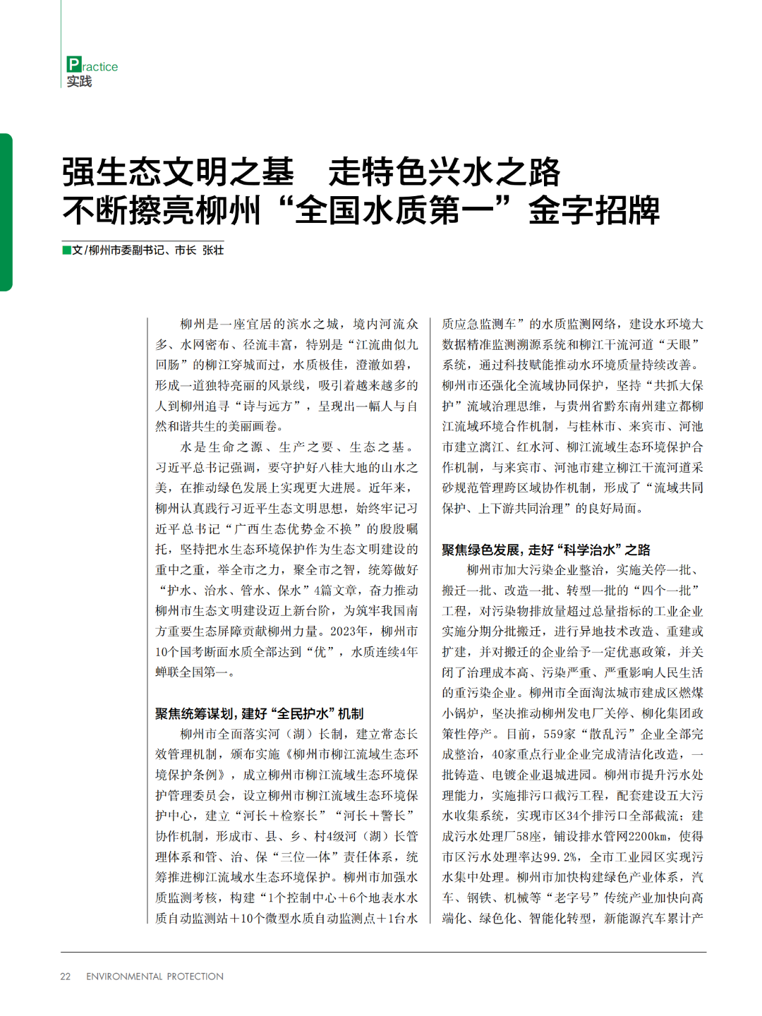 水是生命之源、生产之要、生态之基。习近平总书记强调,要守护好八桂大地的山水之美,在推动绿色发展上实现更大进展。近年来,柳州认真践行习近平生态文明思想,始终牢记习近平总书记“广西生态优势金不换”的殷殷嘱托,坚持把水生态环境保护作为生态文明建设的重中之重,举全市之力,聚全市之智,统筹做好“护水、治水、管水、保水”4篇文章,奋力推动柳州市生态文明建设迈上新台阶,为筑牢我国南方重要生态屏障贡献柳州力量。2023年,柳州市10个国考断面水质全部达到“优”,水质连续4年蝉联全国第一。