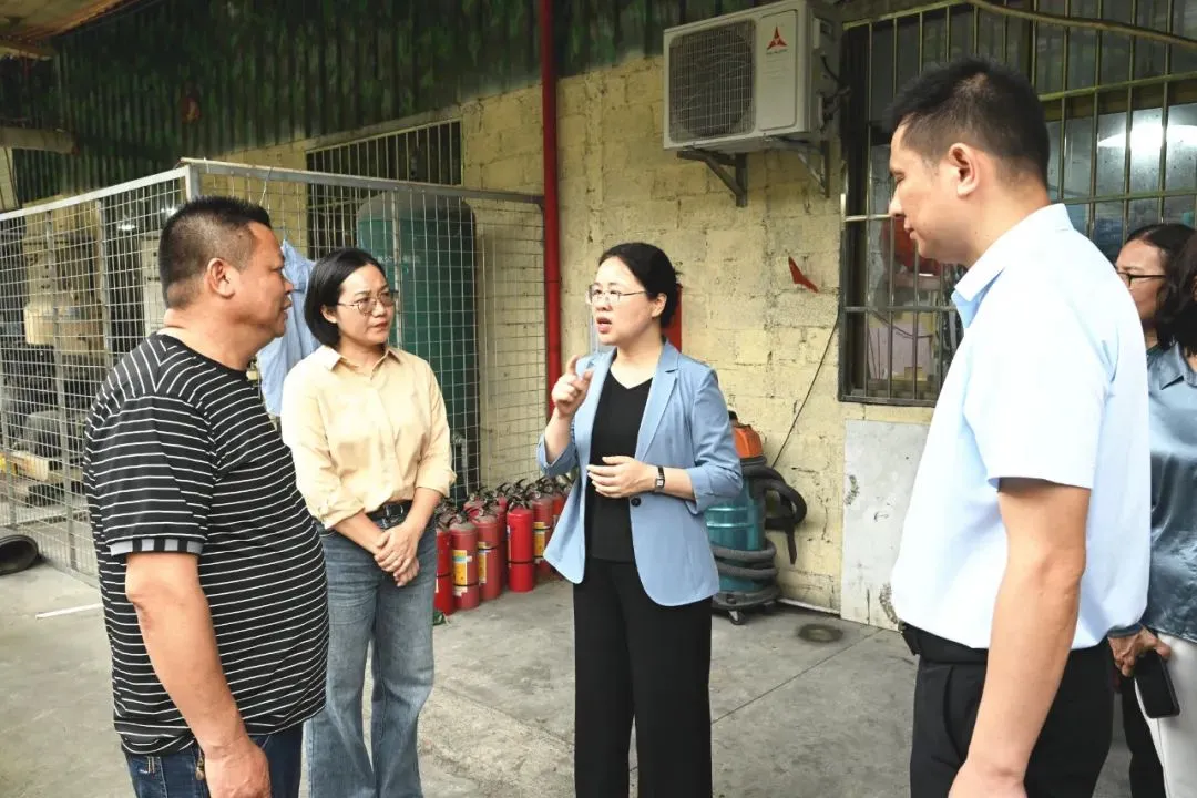 钟畅姿(左三)到浦北县官垌镇鸿锋金属制品有限公司,检查“散乱污”企业整合搬迁情况。融媒体记者 王湖禄 摄