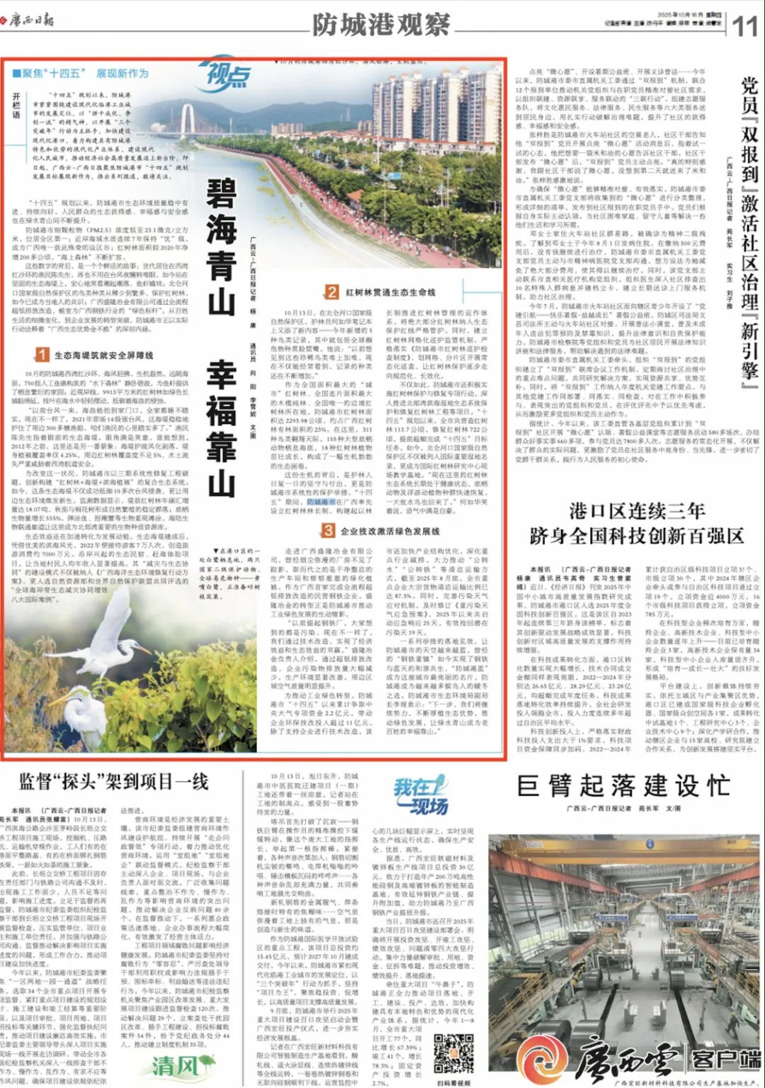 这些数字的背后,是一个个鲜活的故事:世代居住在西湾红沙环的渔民陈先生,再也不用在台风夜辗转难眠,如今站在坚固的生态海堤上,安心地笑看潮起潮落、鱼虾嬉戏;北仑河口国家级自然保护区的鸟类种类从稀少到繁多,保护红树林,如今已成为当地人的共识;广西盛隆冶金有限公司通过全流程超低排放改造,蜕变为广西钢铁行业的“绿色标杆”。从百姓生活的细微变化,到企业发展的转型突破,防城港市正以实际行动诠释着“广西生态优势金不换”的深刻内涵。