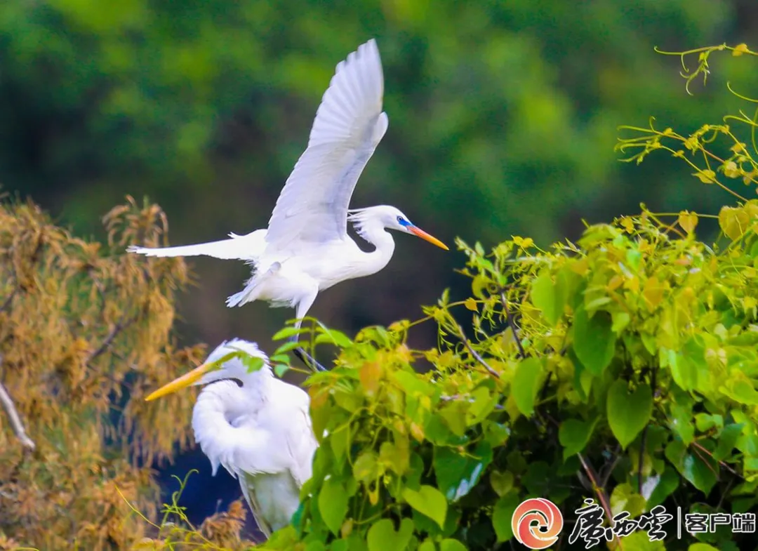 在港口区的一处白鹭栖息地,两只国家二级保护动物、全球易危物种——黄嘴白鹭,正准备叼树枝筑巢。