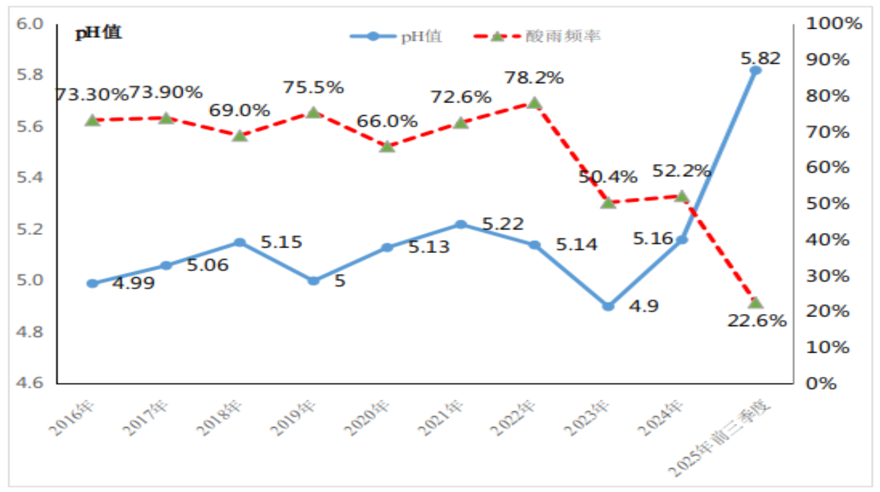 2025年1—9月的监测数据显示,桂林市城区酸雨频率降至22.6%,较去年同期下降36.0个百分点,创下自2016年以来的最低纪录。降水pH均值稳步上升至5.82,同比改善0.62个单位。这一变化标志着桂林市酸雨污染态势已从局部改善转向全域好转,反映出近年来综合治理措施正在发挥显著成效。特别值得关注的是,8月份降水pH均值达到5.93,创下单月历史最佳水平,展现出污染防治工作的持续向好态势。