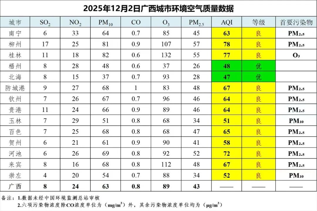 12月2日广西城市环境空气质量数据