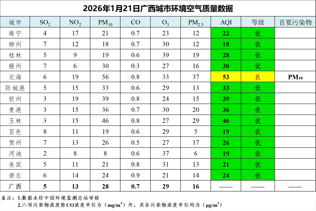 1月21日广西城市环境空气质量数据